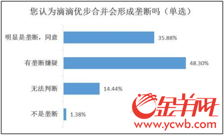 滴滴优步合并后,在国内网约车市场的份额已超过90%,有专家认为已经形成垄断地位。对于这一观点,公众的看法如何?调查发现,35.88%的受访者认为“明显是垄断,同意”,48.30%的受访者认为“有垄断嫌疑”,14.44%认为无法判断,仅有1.38%的受访者认为不是垄断。也就是说,有84.18%的受访者认为滴滴优步合并后已经形成了垄断地位。