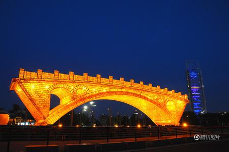 “丝路金桥”由当代艺术家舒勇创作,历时两年,以举世瞩目的赵州桥为创作原型,全长28米、高6米、宽4米,以“一带一路”战略构想为创作背景,由近2万块嵌有“一带一路”范围内53个国家、94个城市的国花或市花的“丝路金砖”拼装而成。
